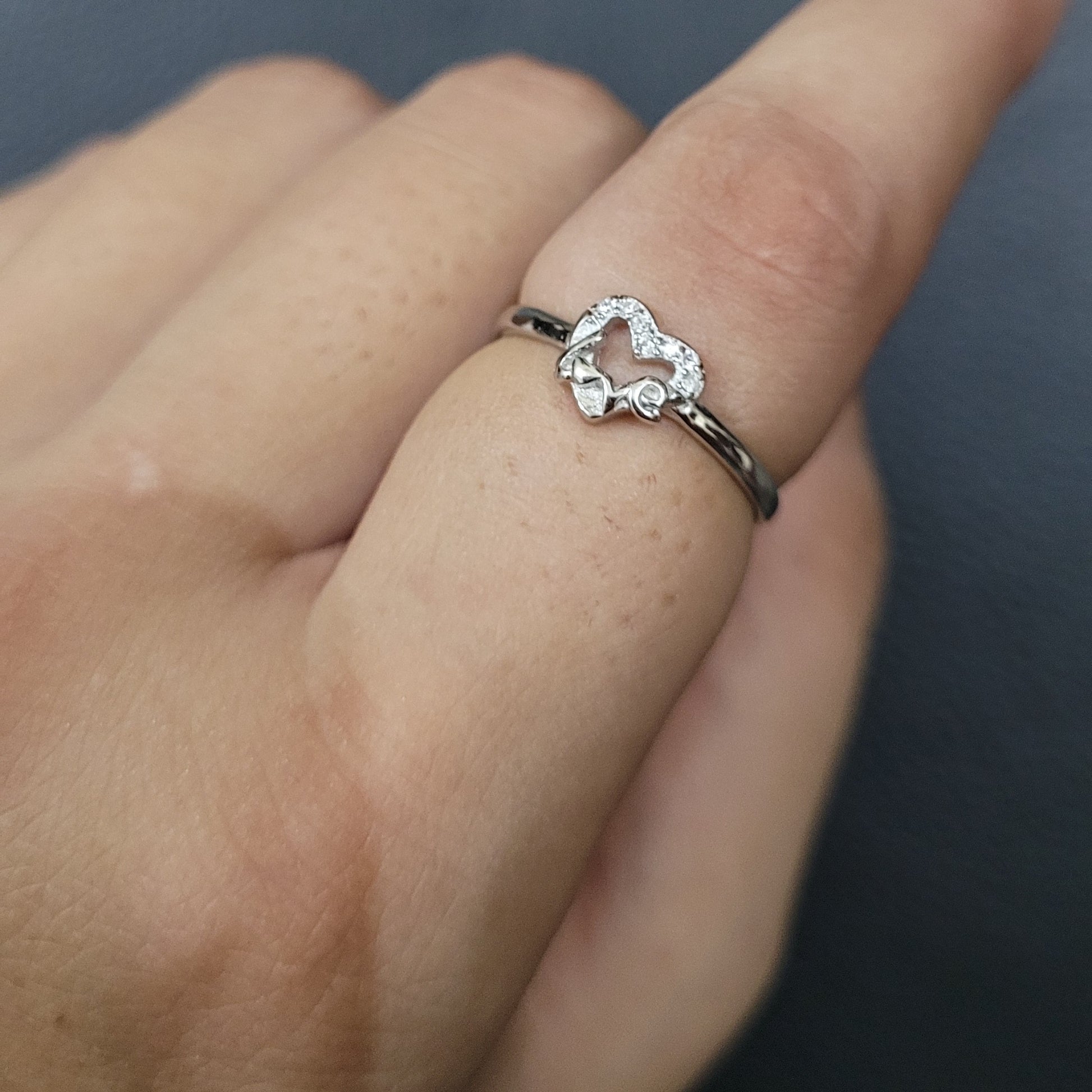 Sterling Silver Butterfly Heart Ring with Cubic Zirconia, Adjustable Band